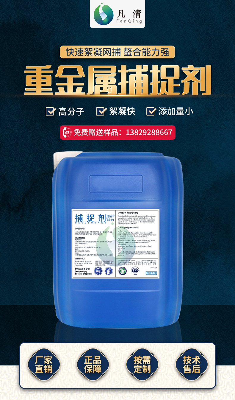 重金属捕捉剂是一种能与重金属离子发生化学反应,形成稳定沉淀物的化学药剂。它通常含有特定的官能团,如氨基、硫基等,这些官能团对重金属离子具有强烈的亲和力。当捕捉剂加入到煤炭废水中时,其官能团会与重金属离子迅速结合,形成不溶于水的螯合物或沉淀物。这些沉淀物可以通过沉淀、过滤等工艺从废水中分离出来,从而实现重金属的有效去除。